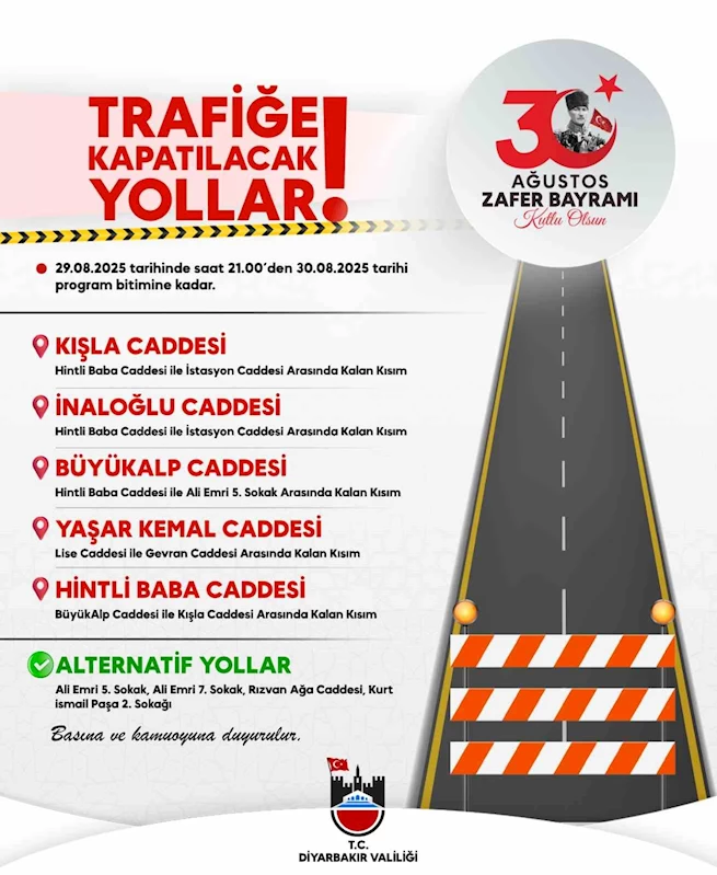 Diyarbakır Valiliği'nden yapılan açıklamada, 30 Ağustos Zafer Bayramı kutlamaları ile ilgili olarak vatandaşların etkinliğin yapılacağı alana yakın yollarda giriş ve çıkışlarda mağdur olmaması adına etkinlik süresince trafiğe kapatılacak olan yollar ile alternatif güzergahların belirlendiği kaydedildi.