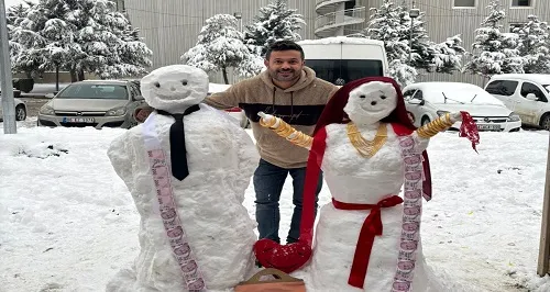Karın yoğunluğu ve yağışın görsel güzelliğinden ilham alan esnaflar, kardan kadın ve kardan erkeği yalnızca yapmakla kalmadı, ikisi için temsili bir düğün töreni de düzenledi. Kardan çifte takılar takıldı, çevredeki esnaflar da bu eğlenceli ana eşlik etti.