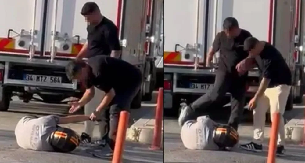 Yumrukların havada uçuştuğu kavgada motosikletli aldığı darbelerle yere düştü. Bu sırada otomobildeki 2 kişi, yerdeki motosiklet sürücüsüne defalarca tekme attı. O anlar ise çevredeki vatandaşların cep telefonu kameralarına saniye saniye yansıdı.