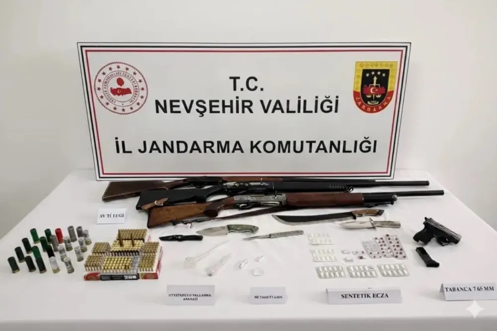 Adreslerde yapılan aramalarda; 190,7 gram metamfetamin, 203,8 gram bonzai, 75,8 gram kubar esrar, 790 adet sentetik ecza hapı, 3 adet uyuşturucu kullanma aparatı, 266 adet fişek, şarjör, 6 adet bıçak, 3 adet ruhsatsız av tüfeği, tabanca, 5 adet cep telefonu ve 5 adet SIM kart ele geçirildi.