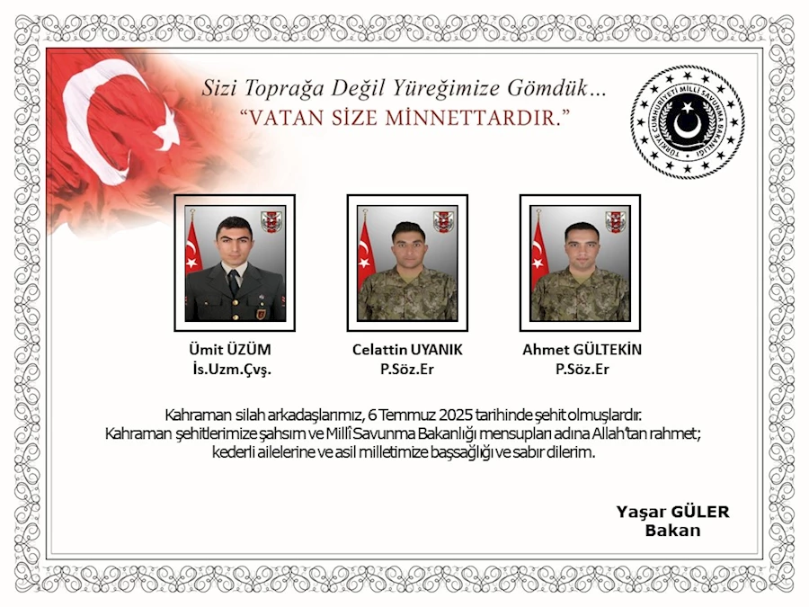 Milli Savunma Bakanlığı’nın sosyal medya hesabından yapılan paylaşımda, Pençe-Kilit Harekatı bölgesinde metan gazından etkilenen 3 askerin daha şehit olduğunu belirtilerek, "6 Temmuz, Pençe-Kilit Harekatı bölgesinde 852 rakımlı Tepe’de bölücü terör örgütü mensupları tarafından kullanılan bir mağarada icra edilen arama tarama faaliyetinde, metan gazından etkilenen üç kahraman silah arkadaşımız daha şehit olmuş, şehit olan personel sayısı sekize yükselmiştir. Bizleri derin bir acı ve üzüntüye boğan bu olayda hayatını kaybeden aziz şehitlerimize Allah’tan rahmet, kederli ailelerine, Türk Silahlı Kuvvetleri ile asil milletimize başsağlığı ve sabır, etkilenenlere de acil şifalar dileriz" ifadelerine yer verildi.