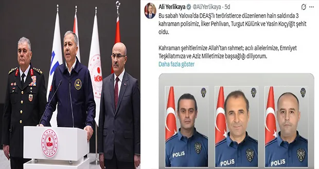 İçişleri Bakanı Ali Yerlikaya, Yalova'da DAİŞ'e yönelik düzenlenen operasyonda 3 polisin hayatını kaybettiğini duyurdu.