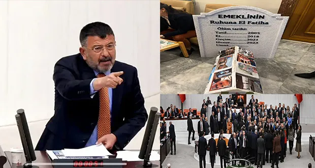 CHP Malatya Milletvekili Veli Ağbaba, TBMM’de görüşülen en düşük emekli aylığını 20 bin liraya çıkaran kanun teklifi görüşülürken kürsüye kartondan yapılmış tabut ve “Emeklinin Ruhuna Fatiha” yazılı karton mezar taşıyla çıktı. AKP Milletvekilleri kürsüye yürürken Ağbaba, “Emekliyi mezara sokarken utanmıyorsunuz da o karton tabuttan mı utanıyorsunuz? Tabuta vampirler saldırır” diye tepki gösterdi.
