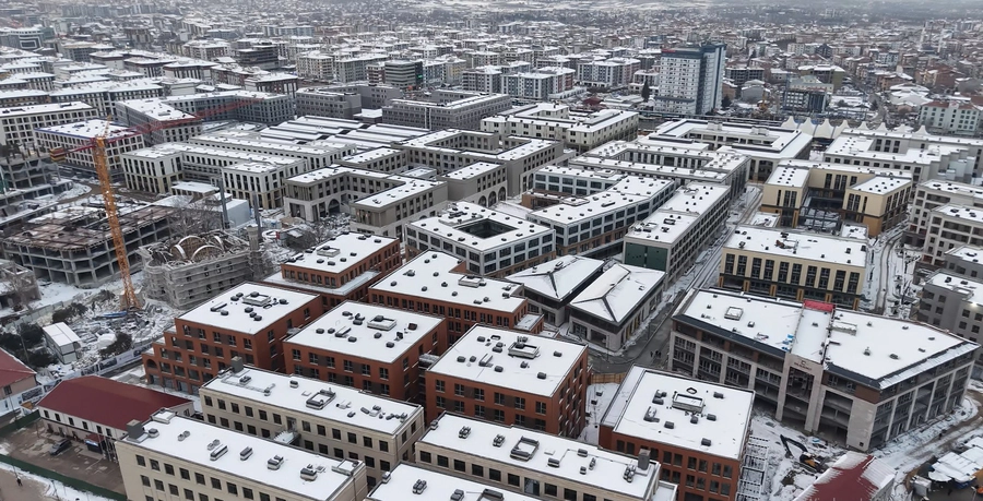 Malatya’da etkili olan kar yağışı, kentin yeni çarşı merkezini beyaza bürüdü. 6 Şubat Kahramanmaraş merkezli depremlerde tamamen yıkılan eski çarşının yerine inşa edilen yeni çarşı, karla kaplanan görüntüsüyle drone kamerasına yansıdı.