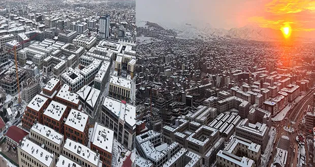 6 Şubat depremlerinde tamamen yıkılan Malatya çarşısının yerine inşa edilen yeni çarşı merkezi, etkili olan kar yağışıyla beyaza büründü. Gün batımında drone ile havadan kaydedilen görüntüler, kentin küllerinden doğan yeni yüzünü kartpostallık manzaralarla gözler önüne serdi.