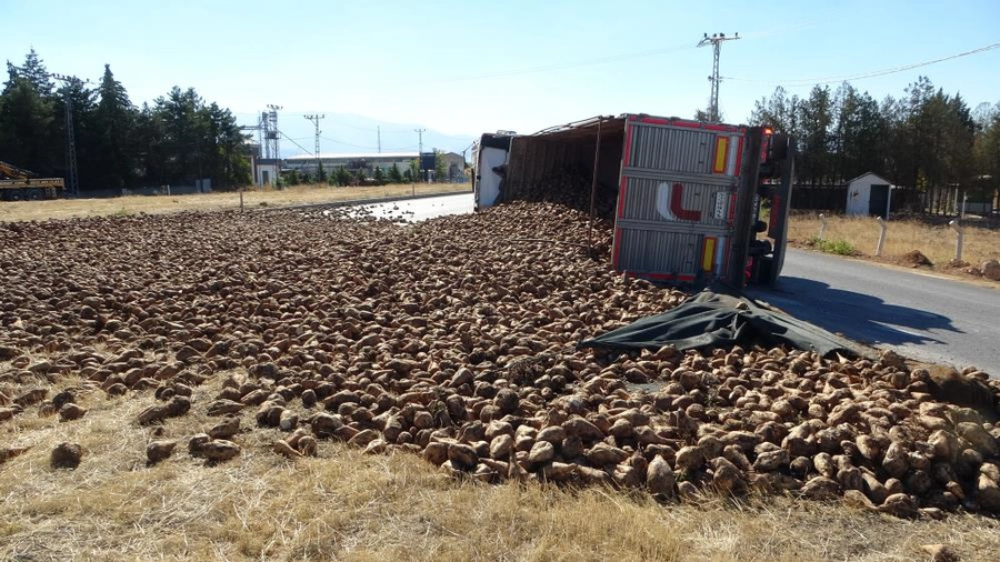 Devrilen tırdaki tonlarca pancar yola savruldu