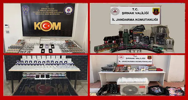 Ayrıca, Şırnak Valiliği İl Jandarma Komutanlığı KOM Şube Müdürlüğü ekiplerince; 21 Temmuz - 25 Temmuz 2025 tarihleri arasında (17) Kaçakçılık , (1) Mali, (1) Narkotik suç olmak üzere meydana gelen toplam (19) suç olayı ile ilgili yapılan istihbari çalışmalarda; Toplam (19) şüpheli şahsa ait olan ev, eklenti ve araçlarda yapılan aramalarda; 2 Gram Esrar Maddesi, 10.457 Adet Bandrolsüz Sigara, 15 Adet Elektronik Sigara, 345 Adet Elektronik Sigara Likiti, 57 Kg Çay, 13 Kg Nargile Tütünü, 17 Adet Cep Telefonu, 32 Adet Cep Telefonu Şarj Adaptörü, 24 Çift Ayakkabı, 102 Adet Termos, 2.005 Adet Oyuncak, 19 Adet Klima, 6 Adet Kaynak Makinesi, 23 Adet Diğer Elektronik Eşya, 766 Adet Muhtelif İnşaat Malzemesi, 62 Adet Anahtar Takımı,172 Adet Kozmetik Eşya, 65 Adet Süs Eşyası, 48 Adet Muhtelif Yedek Parça ele geçirilmiştir. Yakalanan malzemelerin piyasa değeri yaklaşık (5.645.645 TL)’dir.