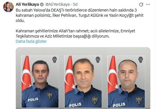 İçişleri Bakanı Ali Yerlikaya, Yalova'da DAİŞ'e yönelik düzenlenen operasyonda 3 polisin hayatını kaybettiğini duyurdu.