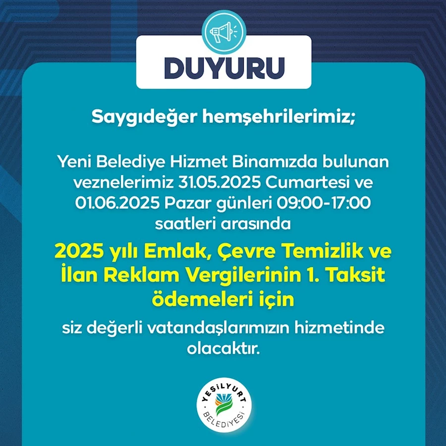 Yeşilyurt Belediyesi, 2025 yılı Emlak, Çevre Temizlik ve İlan Reklam vergisi 1. Taksit ödemeleri için Yeşilyurt Belediye Hizmet Binasındaki vezneleri hafta sonunda açık tutacak. Vezneler, 31 Mayıs Cumartesi ve 01 Haziran Pazar günü saat 09:00 ile 17:00 arasında vatandaşların hizmetinde olacak.